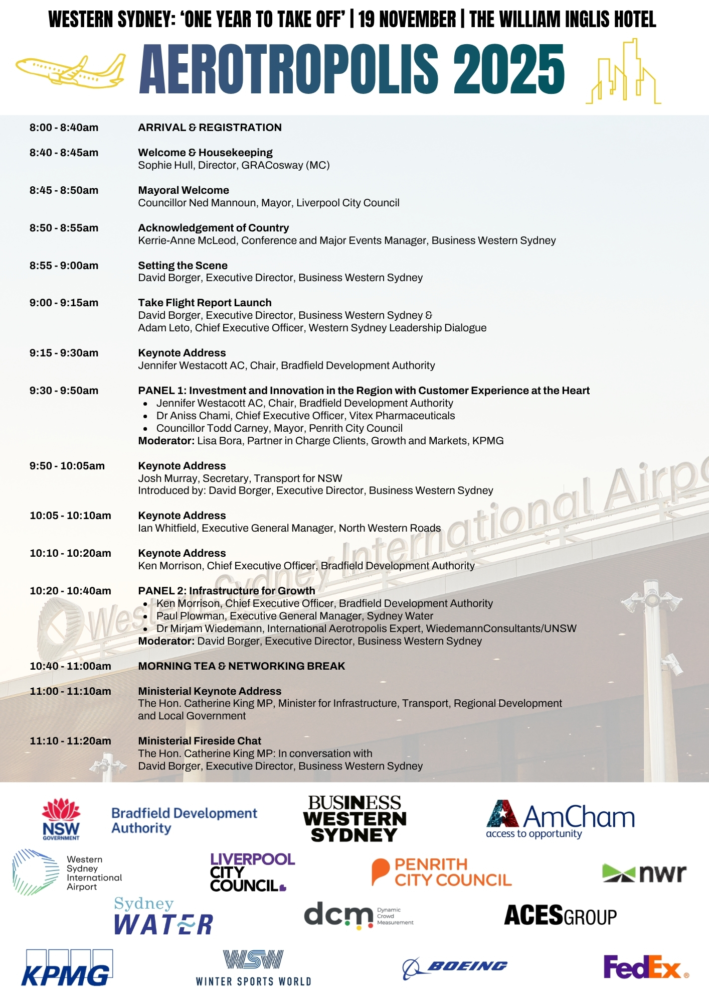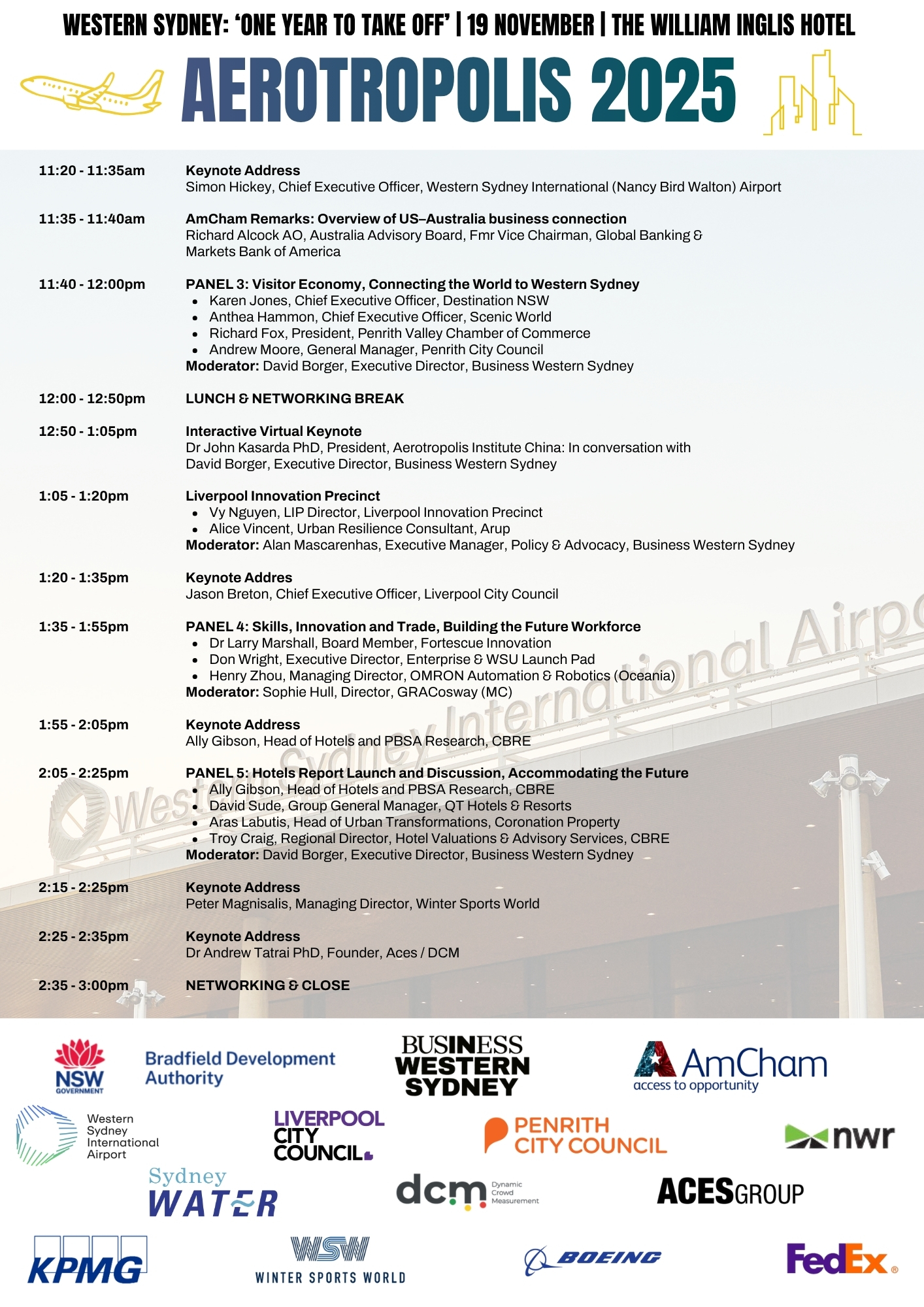 Join us for the Aerotropolis Conference on Wednesday 19 November 2025. This year Business Western Sydney, the American Chamber of Commerce in Australia (AmCham), and the Bradfield Development Authority are working together to bring this conference to life.